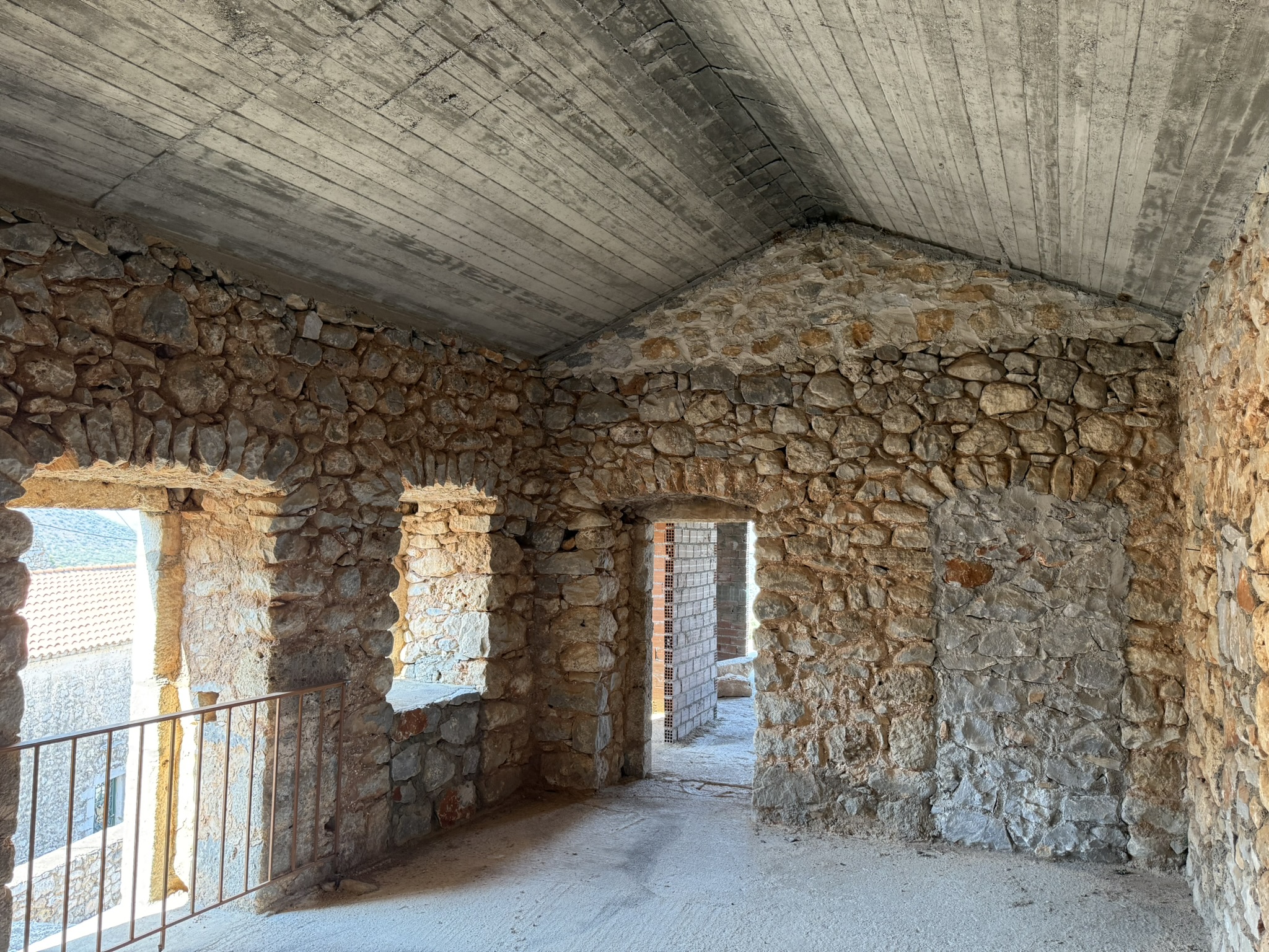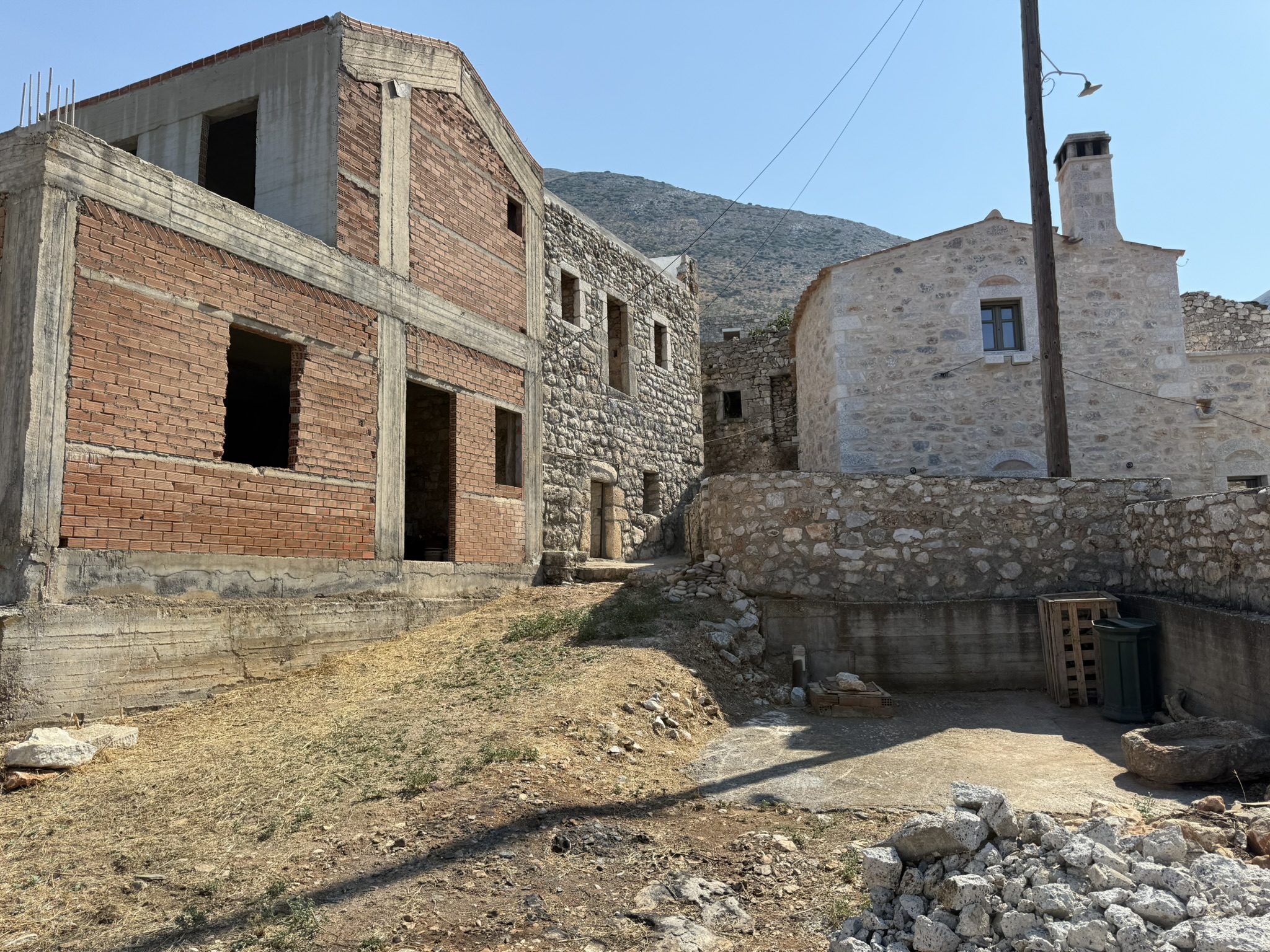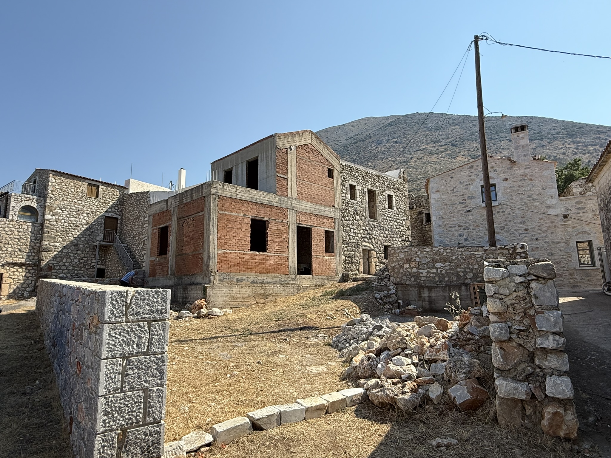 Αυτή η πανέμορφη μονοκατοικία – μεζονέτα, χαρακτηριστικό δείγμα των πέτρινων παραδοσιακών κτισμάτων της περιοχής της Μάνης, συνδυάζει το παραδοσιακό στοιχείο με το νέο, καθώς τμήμα αυτής είναι εξ ολοκλήρου κατασκευασμένο από παραδοσιακά πέτρινα τοιχία και το υπόλοιπο τμήμα όπως φαίνεται και στις φωτογραφίες, έχει κατασκευαστεί από οπλισμένο σκυρόδεμα και τούβλα και από τα σχέδια της οικοδομικής άδειας προβλέπεται τα τοιχία και αυτού του τμήματος να επενδυθούν με παραδοσιακή πέτρα.